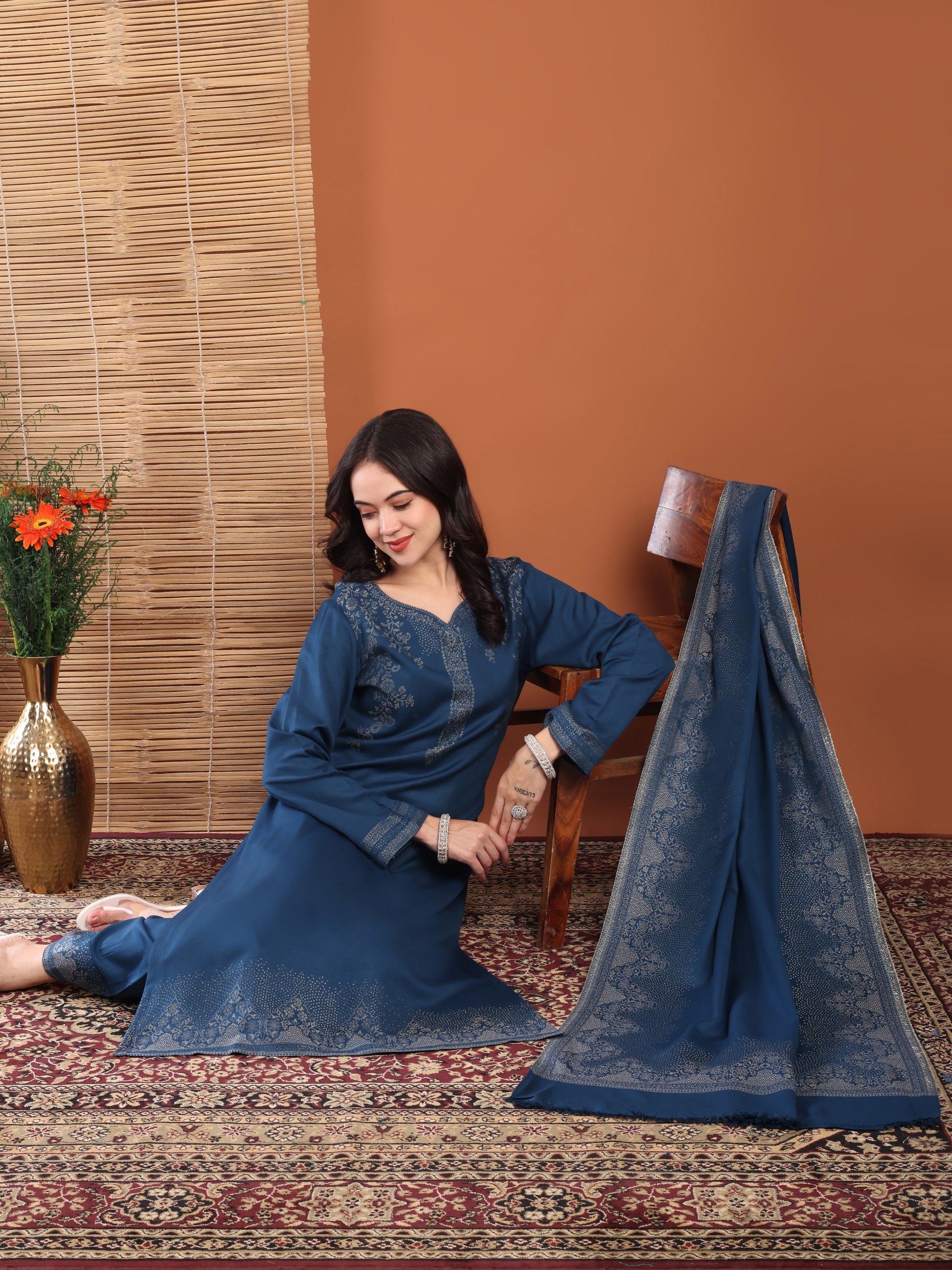 Experience the unmatched softness and natural warmth of premium Pashmina wool, crafted as unstitched lengths so you can tailor a perfect-fit suit that reflects your style. Each piece features rich, fade-resistant colours and a luxurious drape that keeps you cosy through pre-winter and winter months.Top -2.5 meter,Bottom -2.5 meter,Sleeve -1 meter,Stole -2 meter